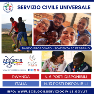 Con Decreto del Capo del Dipartimento n. 116/2023 è prorogato al 20 febbraio 2023, ore 14.00, il termine di presentazione delle domande di servizio civile universale previsto dall’art. 5 del Bando per la selezione di 71.550 operatori volontari da impiegare in progetti afferenti a programmi di intervento di Servizio civile universale da realizzarsi in Italia e all’estero, pubblicato sul sito del Dipartimento per le Politiche Giovanili e il Servizio Civile Universale in data 15 dicembre 2022.